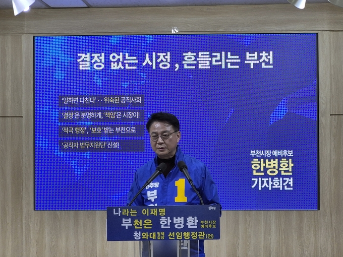 더불어민주당 한병환 부천시장 예비후보가 25일 부천시청 브리핑룸에서 기자회견을 열고 현 시정을 강하게 비판하며 “결정하지 않는 리더십, 책임지지 않는 행정이 부천을 흔들고 있다”고 직격했다.