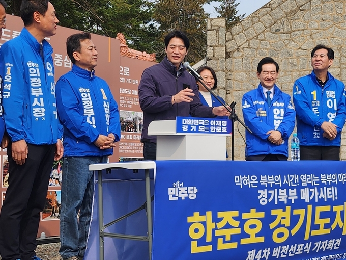 더불어민주당 한준호 경기도지사 경선후보가 1일 의정부시 캠프레드 클라우드에서 기자회견을 열고 경기북부 개발을 위한 핵심 공약을 발표했다.