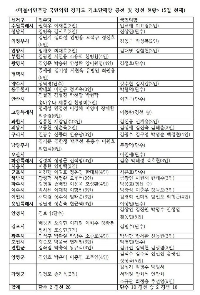 더불어민주당이 연천군, 국민의힘이 수원특례시, 화성특례시, 안양시 기초단체장 후보를 각각 경선하기로 결정하면서 31개 시·군 기초단체장 중 민주당은 오산시 1곳, 국민의힘은 평택시와 부천시, 시흥시 3곳만 공천심사를 남겨두게 됐다.
