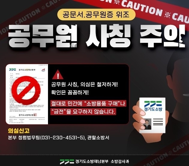 한편 포천소방서 임경수 청문인권담당관은 “공공기관을 사칭한 범죄는 시민들의 불안을 악용하는 행위“라며 “조금이라도 의심스러운 경우, 즉시 소방서에 확인해 피해를 예방해 달라“고 말했다.