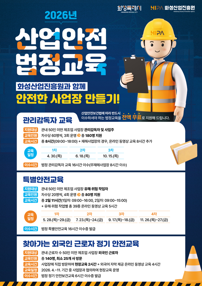 화성산업진흥원이 관내 제조업 사업장의 산업재해 예방과 안전관리 역량 강화를 위해 ‘2026년 산업안전 법정교육 지원사업’을 추진한다.