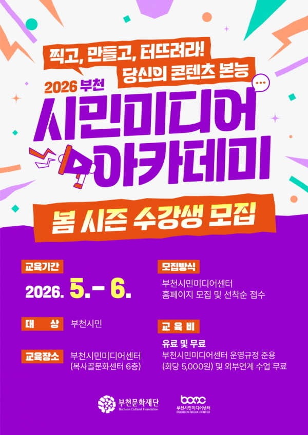 부천문화재단이 운영하는 부천시민미디어센터는 오는 5월부터 6월까지 시민의 디지털 역량을 높이기 위한 ‘2026 부천 시민미디어 아카데미’를 운영한다.