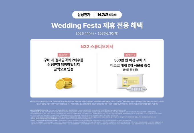 예비부부 및 신혼부부를 위한 이번 프로모션은 삼성전자 웨딩 마일리지 신규 가입 후 삼성스토어 오프라인에서 모든 삼성카드로 1000만 원 이상 구매 시 참여할 수 있다. 이후 전국 N32 스튜디오에서 N32 제품을 구매하면 결제 금액이 2배로 자동 산정돼 마일리지가 ‘더블 적립’된다. 여기에 500만 원 이상 구매 시 약 50만 원 상당의 비스코 스프링 베개 2개도 사은품으로 증정한다.