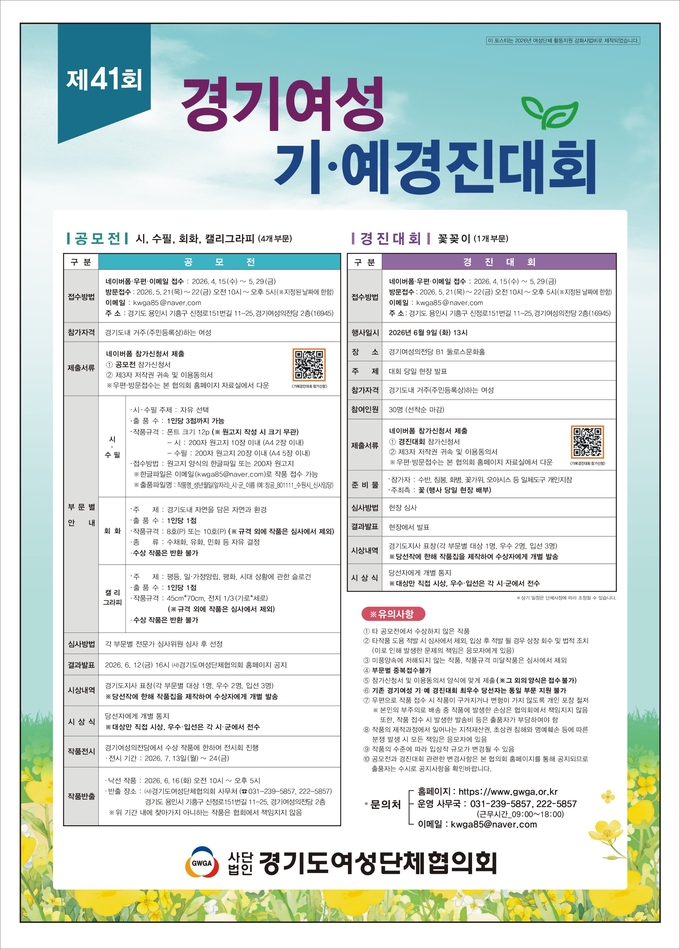㈔경기도여성단체협의회가 여성의 예술적 재능 발굴과 사회참여 확대를 위해 '제41회 경기·예 경진대회'를 개치한다.