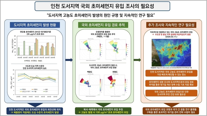 연구에서 인천 도서지역은 도시나 산업시설 등 오염 배출원이 거의 없는 ‘국가배경지역’이지만 초미세먼지(PM2.5) 연평균 농도는 대기환경기준(15㎍/㎥)을 지속적으로 초과하는 것으로 나타났다.