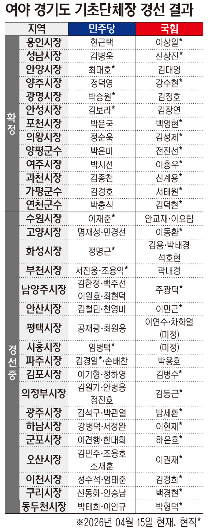 국민의힘은 앞서 용인(이상일)·고양(이동환)·성남(신상진) 등 9곳을 단수 공천하며 일찌감치 현직에 힘을 실어줬고, 나머지 13곳 역시 경선을 거치며 현역 지자체장이 전원 공천장을 따냈다.