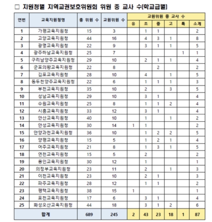신미숙 경기도의원이 도교육청으로부터 받은 ‘지역 교권보호위원회 교사위원 현황’ 자료에 따르면, 광주하남교육지원청 교보위는 전체 25명 중 교사위원이 1명뿐이다.