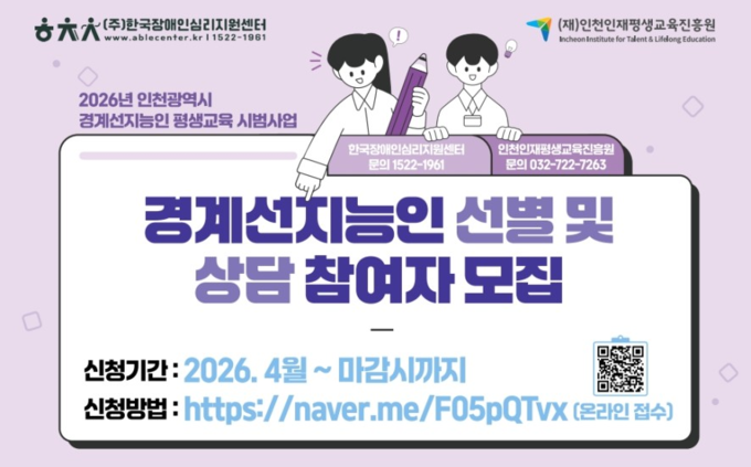 (재)인천인재평생교육진흥원에서는 지역 내 경계선지능 성인의 발굴과 맞춤형 지원을 위해‘경계선지능인 선별 및 상담 지원’ 참여자를 모집한다.