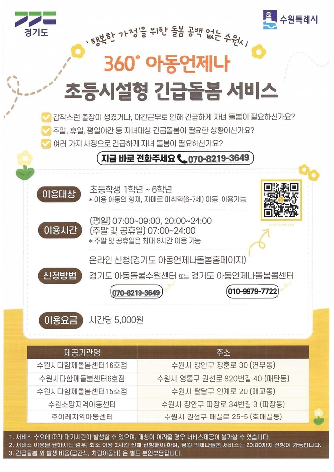 주말이나 휴일, 자정까지의 야간 시간 등을 비롯해 등교 전인 오전 7시부터 서비스를 제공한다. 장안구 2곳(연무동, 파장동), 권선구 1곳(호매실동), 팔달구 1곳(매교동), 영통구 1곳(매탄동) 등 총 5개 돌봄 기관에서 최대 8시간을 맡아준다.