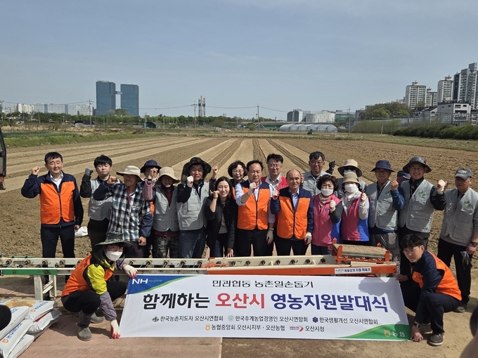 오산시농협 임직원봉사단(NH농협오산시지부·오산농협)은 23일 본격적인 영농철을 맞아 “오산시 민관합동 영농지원 발대식”을 열고 농촌 일손돕기 활동에 나섰다.
