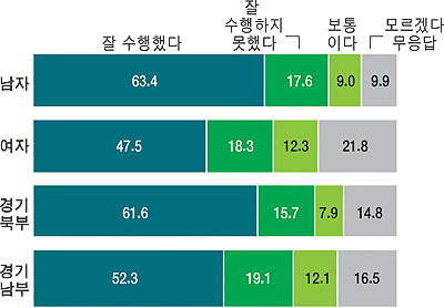 특히 손 지사가 직무수행을 ‘잘하고 있다’고 답한 응답자군을 성별로 살펴보면, 남성(63.4%)이 여성(47.5%)보다 다소 후한 점수를 준 것으로 조사됐다.
