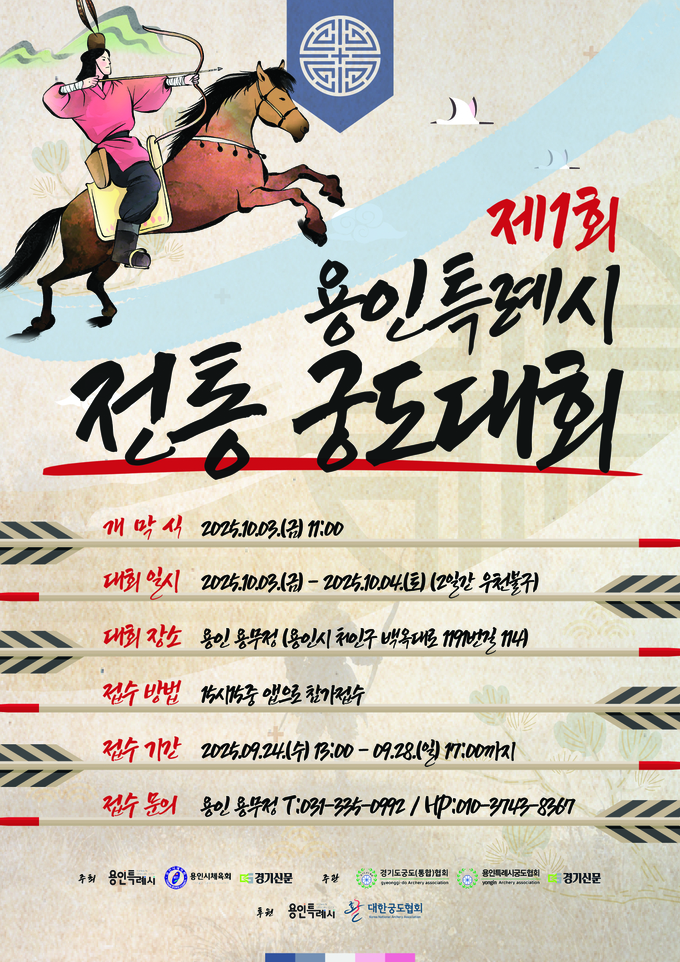 경기신문과 용인특례시는 생활체육으로서의 궁도 종목 저변확대 및 국 민정서 함양과 체력 증진을 위하여「제1회 용인특례시 전통 궁도대회」를 개최합니다. 역사와 전통문화의 소중함을 깨우는 화합의 장이 될 이번 대회에 생활 체육 궁도 동호인을 비롯한 시민들의 많은 참여 바랍니다.
