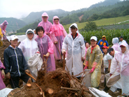 이 수해현장에서는 고추밭과 마당에 쌓인 흙더미를 삽으로 퍼내고 마대 자루에 담아 둑을 쌓는 작업을 했다. 가축 분뇨와 뒤섞여 악취가 나는 흙을 퍼 담아 나른 마대 자루는 모두 300여 자루. 막노동 현장이나 다름없었다.