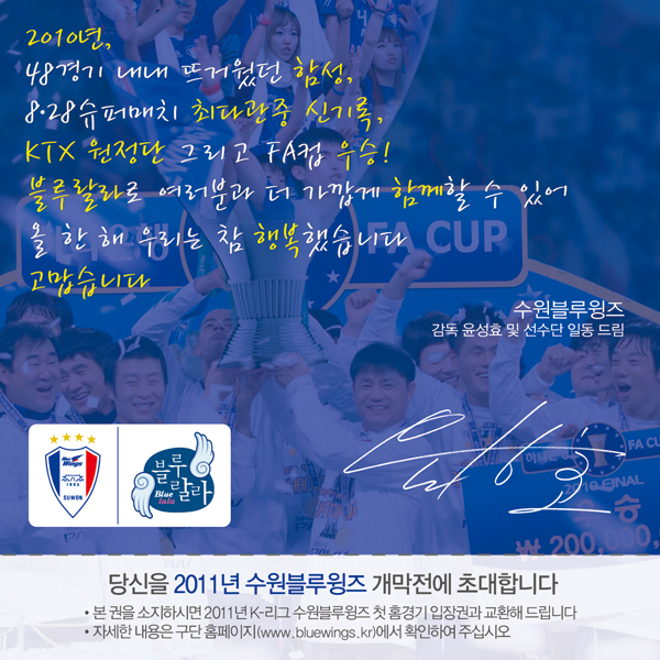 QR코드를 삽입한 감사의 블루랄라 러브레터 카드에는 염기훈, 김두현, 이상호, 양상민 등 수원선수들이 평소에 보여 주지 않았던 익살스러운 모습과 NG 장면 등이 담겨 있으며 2011 시즌 개막전 초청장 기능도 겸하고 있어 시즌 최종전에 왔던 팬들이 내년 자연스레 다시 수원 홈구장을 찾을 수 있도록 디자인 됐다.