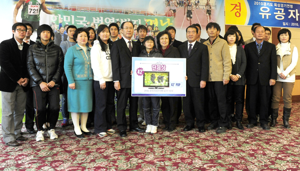 도육상경기연맹은 8일 용인 삼성노블카운티 4층 대연회실에서 허영호 연맹 회장과 안선엽 도교육청 평생체육건강과장, 유병우 도체육회 운영과장을 비롯해 선수와 가족 등 70여명이 참석한 가운데 2010년 경기도육상경기연맹 유공자 시상식을 갖고 지난 6월 대구에서 열린 제64회 전국육상경기선수권대회 남자일반부 100m 예선에서 10초31로 31년 만에 한국신기록(종전 10초34)을 경신한 김국영에게 최우수선수상을 수여했다.