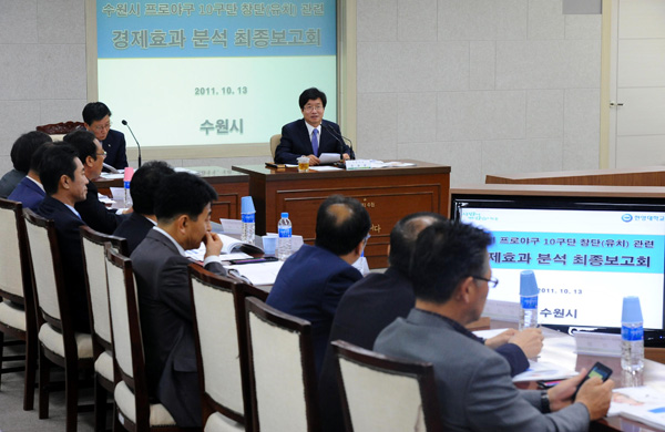 수원시는 13일 시청 중회의실에서 한양대학교 스포츠산업마케팅센터에 의뢰한 ‘프로야구 10구단 창단에 따른 경제효과 분석 연구용역’ 최종보고회를 가졌다.