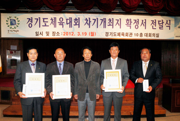 박충호 도 체육과장은 도체육회장인 김문수 도지사를 대신해 올해 도민체전 개최지인 평택시와 2013년 개최지 연천군, 2014년 개최지 안성시 등 3개 시·군체육회 상임부회장에게 각각 유치확정서와 체육진흥기금 500만원씩을 전달했다.