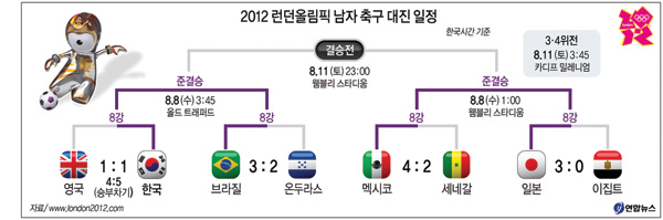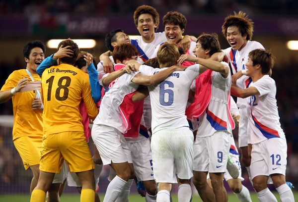 홍명보 감독이 이끄는 대표팀은 5일 새벽 영국 웨일스 카디프의 밀레니엄 경기장에서 열린 2012년 런던올림픽 남자축구 8강전에서 개최국 영국과 연장 120분 접전 끝에 1-1로 비긴 뒤 승부차기에서 5-4로 승리를 거두고 4강에 진출했다.