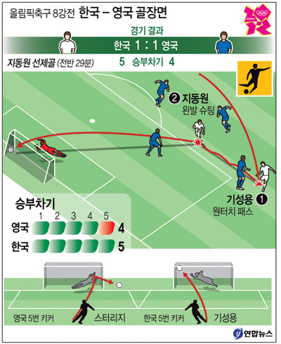 승리의 기회를 잡은 한국은 마지막 키커로 나선 기성용이 영국 골대 왼쪽 구석에 강하게 볼을 꽂아 넣어 4강 진출을 확정했다.