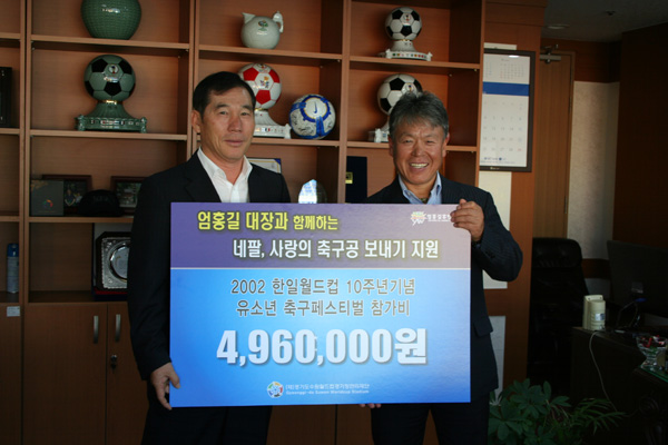 (재)경기도수원월드컵경기장관리재단(이사장 김문수·이하 재단)은 5일 재단 사무총장실에서 ‘2002 한·일 월드컵 10주년 기념 유소년축구페스티벌’ 참가비 496만원 전액을 엄홍길 휴먼재단의 ‘사랑의 축구공 보내기’에 기부했다.