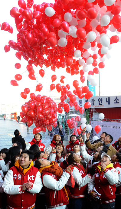 수원을 연고로 프로야구 10구단 창단을 준비중인 KT가 9일 수원역 광장에서 ‘프로야구 10구단 유치기원 KT스포츠단 사통팔달 팬사인회’를 개최했다.▶관련기사 18면
