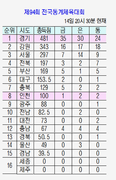 도는 13일 강원도 평창 용평리조트와 알펜시아경기장, 서울 태릉국제빙상장, 울산과학대 아산체육관 빙상장 등에서 대회 사전경기로 열린 빙상과 스키에서 금 35개, 은 30개, 동메달 24개를 획득하며 종합점수 4811점으로 강원도(금 16·은 17·동 18, 343점)와 서울시(금 7·은 14·동 9, 297점)를 따돌리고 선두를 유지했다.