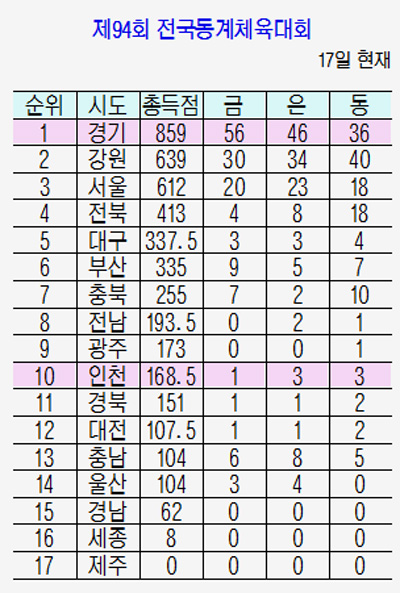 도는 지난 13일부터 16일까지 사전경기로 열린 컬링에서 3년 연속 종목우승을 달성하고 스키 알파인과 크로스컨트리, 빙상 쇼트트랙 등에서 좋은 성적을 거둬 17일 현재 금 56개, 은 46개, 동메달 36개로 859점을 획득, 2위 강원도(금 30·은 34·동 40, 639점)에 220점 차로 앞서며 종합우승이 유력시 됐다.