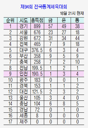 한편 인천시는 금 1개, 은 3개, 동메달 4개로 190.5점을 획득, 전날보다 한계단 상승한 종합 9위를 차지했다.
