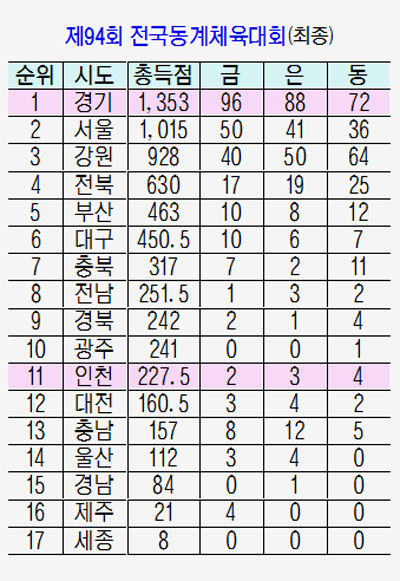 인천시는 금 2개, 은 3개, 동메달 4개로 227.5점을 획득하며 지난해보다 3계단 하락한 종합 11위로 대회를 마감했다.
