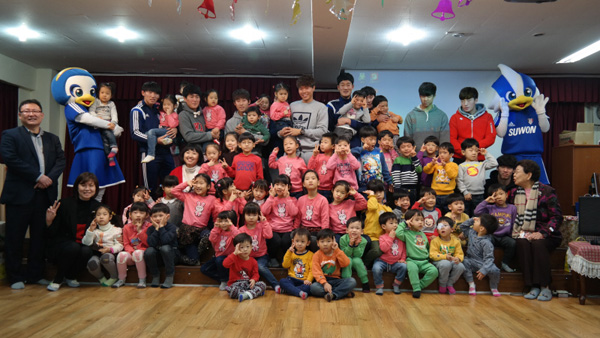 선수들은 어린이들과 함께 레크레이션을 즐긴 뒤 준비해 간 간식을 나눠 먹고 수원 선수단이 지난 1년 동안 팬들과 함께 모은 성금도 전달했다.