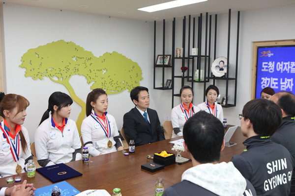 남경필 경기도지사는 23일 경기도청에서 2015~2016년도 컬링 국가대표로 선발된 경기도청 여자팀과 올림픽대표팀으로 선발된 경기도컬링경기연맹 남자팀을 초청해 격려했다.
