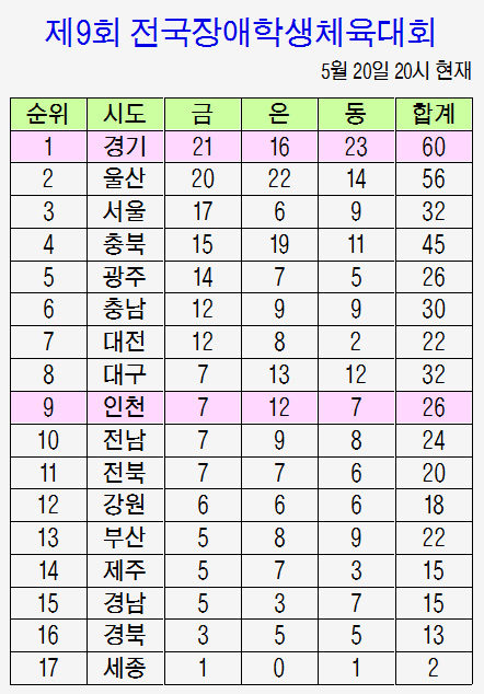 인천광역시는 금 7개, 은 12개, 동메달 7개로 종합 9위를 달리고 있다.