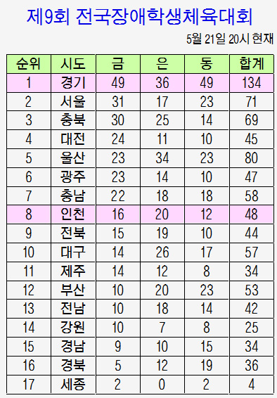 한편 인천광역시는 이날 금 9개, 은 8개, 동메달 5개를 추가해 금 16개, 은 20개, 동메달 12개로 전날보다 한 계단 상승한 종합 8위를 달리고 있다.