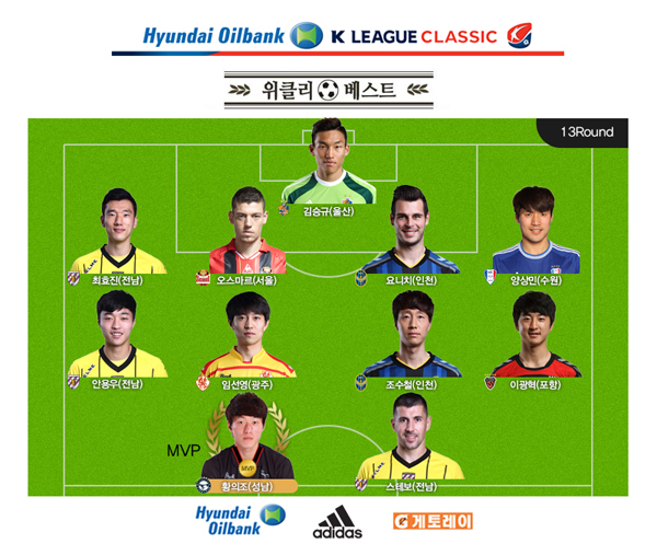 황의조는 전남 드래곤즈의 스테보와 함께 주간 베스트 11의 공격수 부문에도 이름을 올렸다.