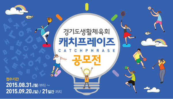 이번 공모전은 생활체육에 관심있는 사람이면 누구나 참여 가능하며 주제는 경기도의 활력을 이끌고 스포츠 공공기관의 가치를 나타내는 참신한 문구로 누구나 쉽게 인지할 수 있는 표현이면 된다.