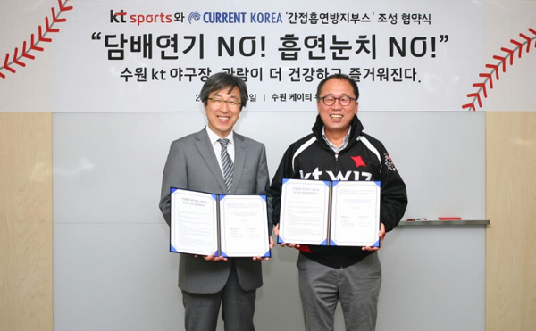 케이티 스포츠는 24일 수원 케이티위즈파크에서 종합홍보대행사 커런트코리아와 ‘간접흡연 방지부스’ 설치 협약을 체결했다.