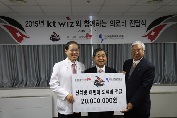 케이티는 2015시즌 홈 구장인 수원 케이티위즈파크 입장 수익 일부(3%)와 팬 페스티벌 선수 애장품 경매금, 시즌 유니폼 판매 등으로 기부금을 조성해 이날 아주대의료원에 기부했다.