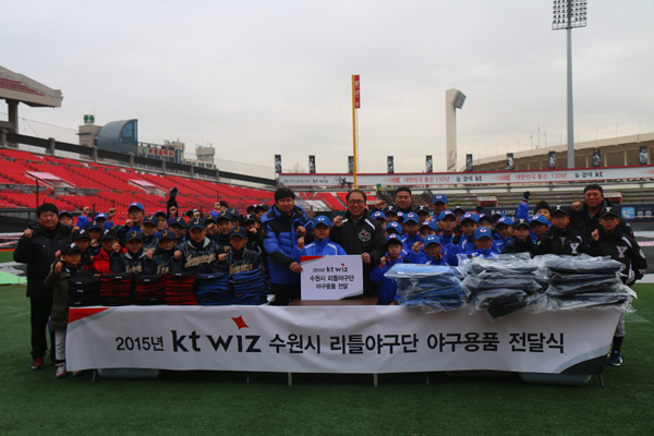 야구용품은 올해 수원 케이티위즈파크 입장권 판매 금액 일부(3%)와 유니폼 판매 건당 500원을 적립해 조성한 기부금으로 구입했다. 케이티는 수원시야구협회와 공동으로 연 이날 행사에서 수원시 장안구·권선구·팔달구·영통구 등 리틀야구단 4개 팀에 겨울 야구 훈련을 위한 넥워머, 풀오버 등 용품을 전달했다.