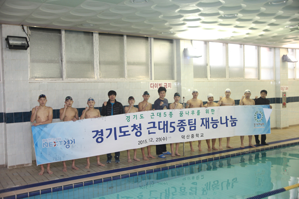 도청 근대5종팀은 근대5종 종목 중 수영종목에 대한 교육을 실시해 수영 요령에 대한 설명과 유연성을 강조하며 직접 시범을 보이고 꿈나무 선수들의 자세를 교정해줬다.