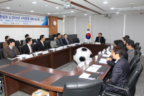 (재)경기도수원월드컵경기장관리재단은 14일 수원월드컵경기장 4층 대회의실에서 경기도수원월드컵스포츠센터(수탁운영사: 유윤스포츠) 2015년 운영성과 및 2016년 수탁운영 보고회를 실시했다.