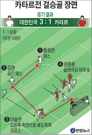 후반 3분 역습 상황에서 황기욱(연세대)이 내준 공간 패스를 류승우가 골대를 비우고 뛰어나온 카타르의 골키퍼를 따돌리는 재치 있는 슈팅으로 선제골을 터뜨린 것. 골대로 굴러가는 볼을 카타르의 수비수 마팀 모하메드가 끝까지 쫓아갔지만 소용없었다.