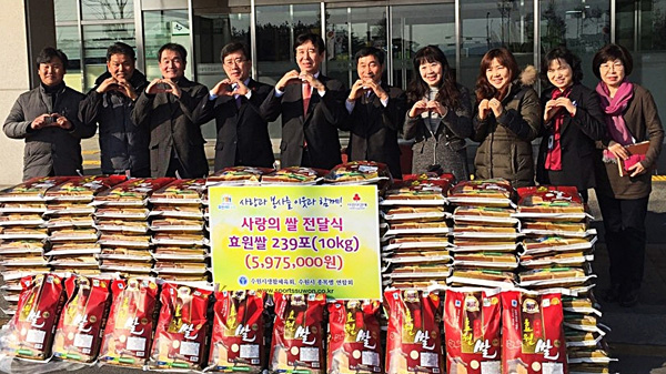 수원시생활체육회는 시 관내 4개 구에 사랑의 쌀을 전달하며 이웃돕기를 실천했다. 시생활체육회는 3일 영통구와 권선구에 각각 효원쌀 10㎏ 239포와 110포를 전달했으며 이에 앞서 지난 2일에는 장안구와 팔달구에 각각 176포와 186포의 쌀을 보내는 등 모두 711포(1천775만5천원)의 쌀을 전달했다. 이번 전달식에는 4개 구 구청장과 최봉근 시생활체육회장을 비롯한 회장단, 임정희 시테니스연합회장, 장월옥 시배드민턴연합회장 등이 참석했다.