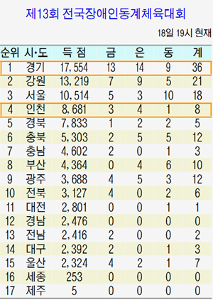 도는 18일 강원도 평창과 춘천, 서울 노원구, 동두천시 등에서 열린 대회 사흘째 알파인스키와 크로스컨트리, 빙상, 휠체어컬링 등 4개 종목이 종료된 가운데 금 13개, 은 14개, 동메달 9개로 종합점수 1만7천554점을 획득, 강원도(1만3천219점, 금 7·은 9·동 5)와 서울시(1만514점, 금 5·은 3·동 10)를 제치고 선두를 유지했다.