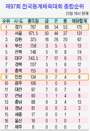 인천시는 은 2개, 동메달 4개로 종합점수 134점을 얻어 종합 9위에 올라 있다.