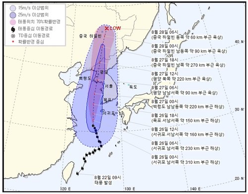 기상청은 태풍이 26일 오후 제주도 서쪽 해상을 지나 이날 밤부터 27일 새벽까지 서해상을 따라 북상할 것으로 예상했다. 이날 오전 5시 기준 태풍은 서귀포 남서쪽 약 260㎞ 해상에서 시속 17㎞로 북진 중이다.