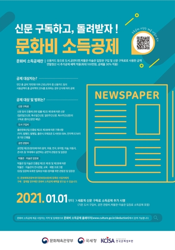 문화체육관광부는 내년부터 종이신문 구독료에 대한 소득공제가 시행됨에 따라 '신문구독료 소득공제 제공 사업자' 신청을 받고 있다고 15일 밝혔다.