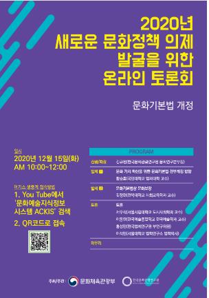 토론회에서는 문화정책 추진체계 정비를 위한 '문화기본법' 개정과 국제문화교류, 문화 공적개발원조(ODA) 확대를 주제로 논의한다. 토론회는 문광연 문화예술정보시스템을 통해 온라인으로 생중계한다.
