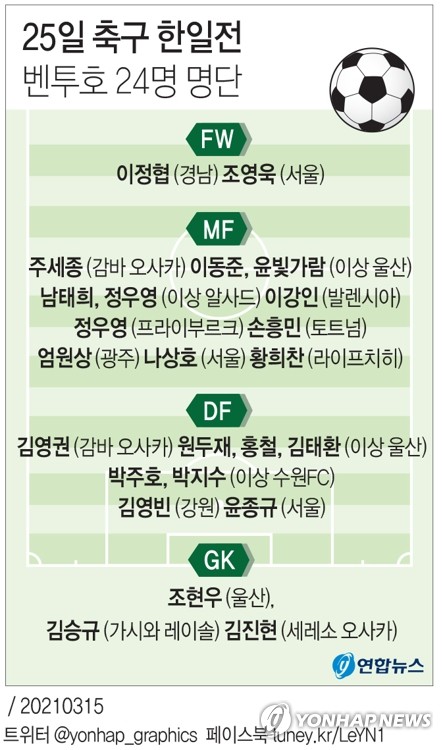 손흥민과 황희찬의 소집이 사실상 불분명한 상황에서 중국 무대에서 뛰는 수비수 김민재(베이징 궈안)와 지난해 K리그1 MVP 손준호(산둥 루넝)를 비롯해 공격수 황의조(보르도)는 코로나19에 따른 소속팀의 차출 반대로 합류하지 못했다.