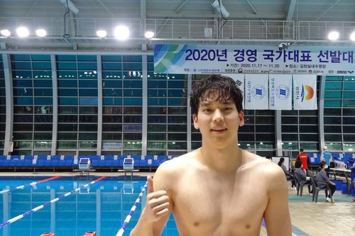 당시 대회에서는 배영 200m에서만 도쿄올림픽 기준기록(1분57초50)을 통과했으나 이번에 배영 100m까지 올림픽 무대 도전 자격을 갖췄다. 대한수영연맹으로부터 신기록 포상금 100만 원도 받는다. /연합뉴스