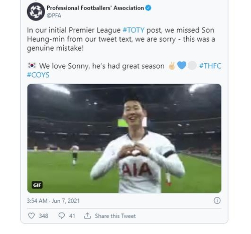 PFA는 7일(한국시간) 소셜네트워크서비스(SNS)에 "올해의 팀을 알리는 포스트에서 손흥민의 이름이 빠졌다. 사과한다. 진짜 실수였다"라는 글을 손흥민의 골 세리머니 영상과 함께 올렸다.